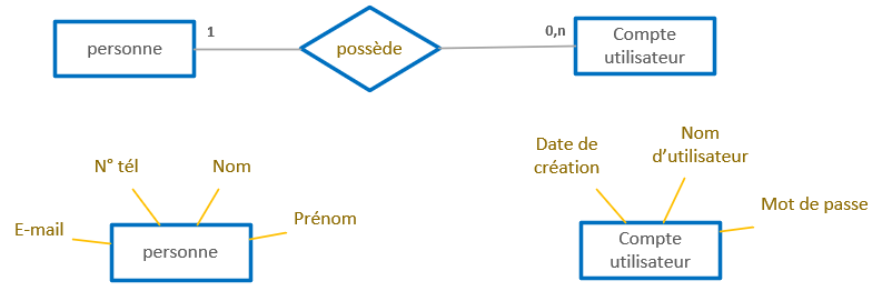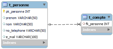 t_compte, une clé étrangère est connectée à la clé primaire de la table t_personne. Un compte est possédé par une seule personne.
